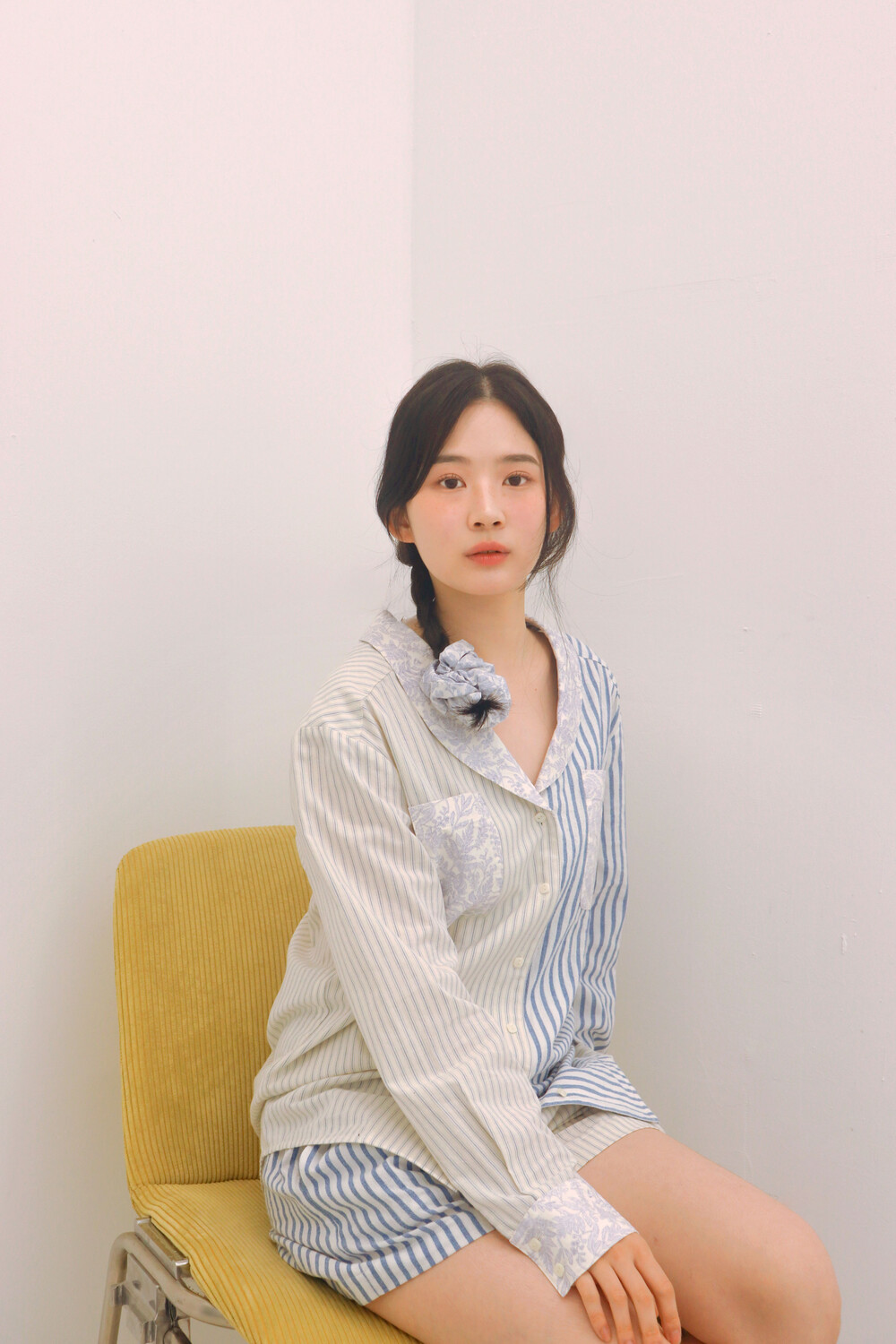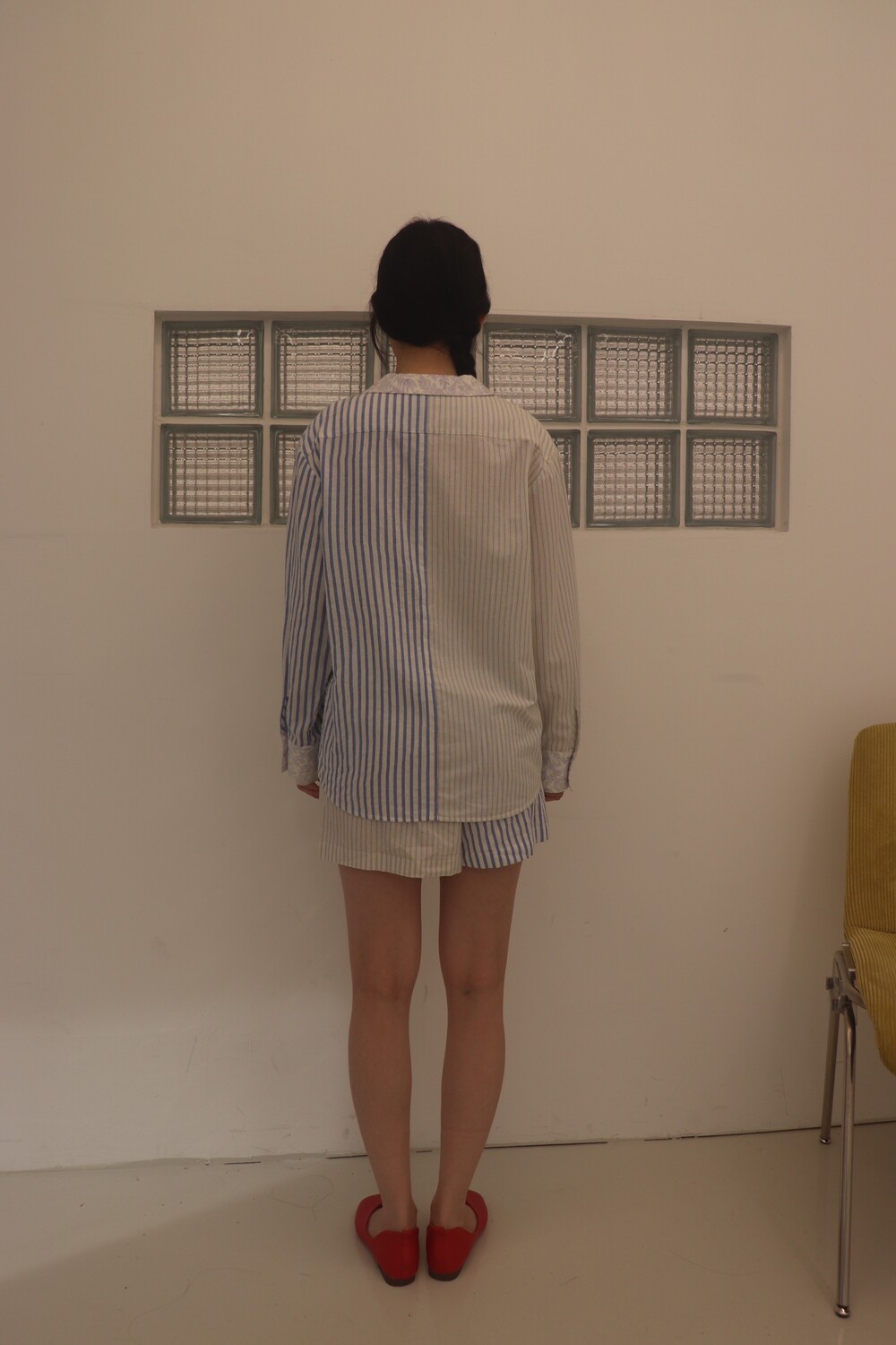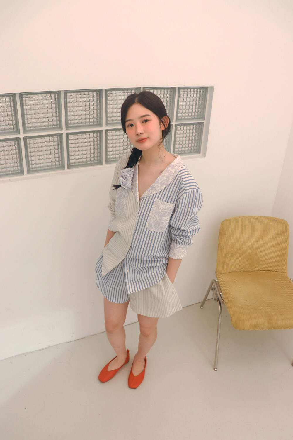 캐주얼한 스트라이프와 여성스러운 넥카라 디자인의 조화,