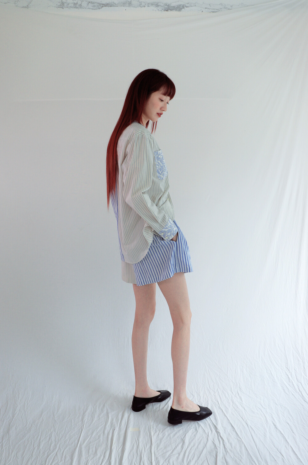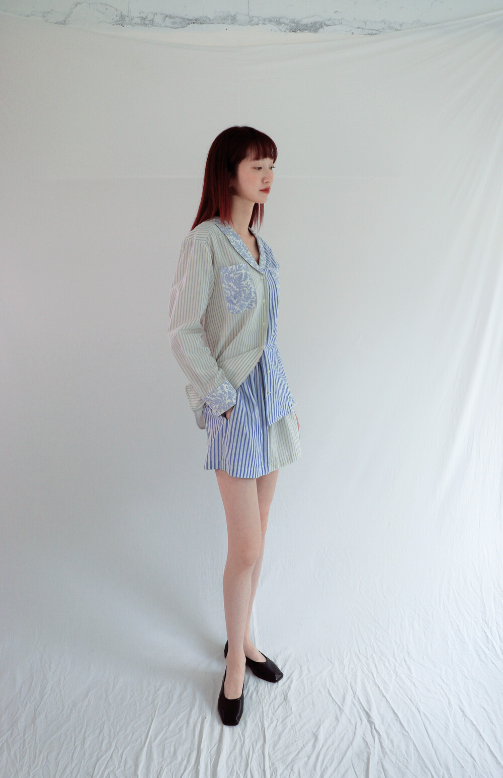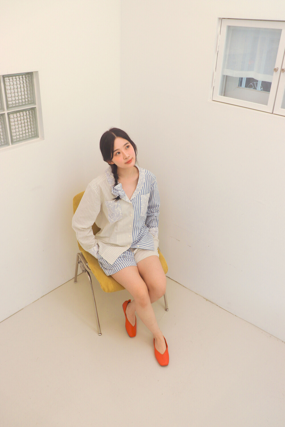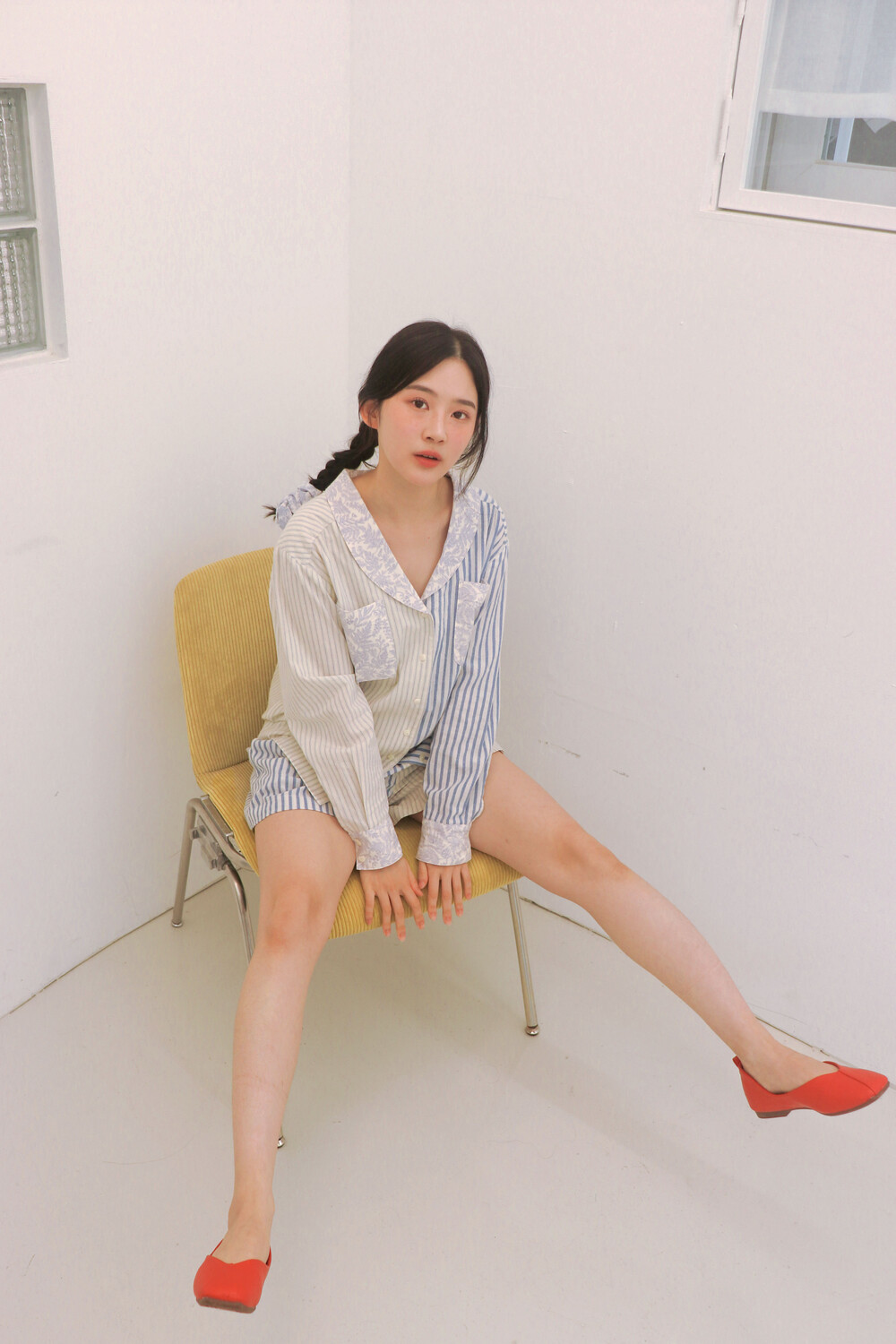 캐주얼한 스트라이프와 여성스러운 넥카라 디자인의 조화,