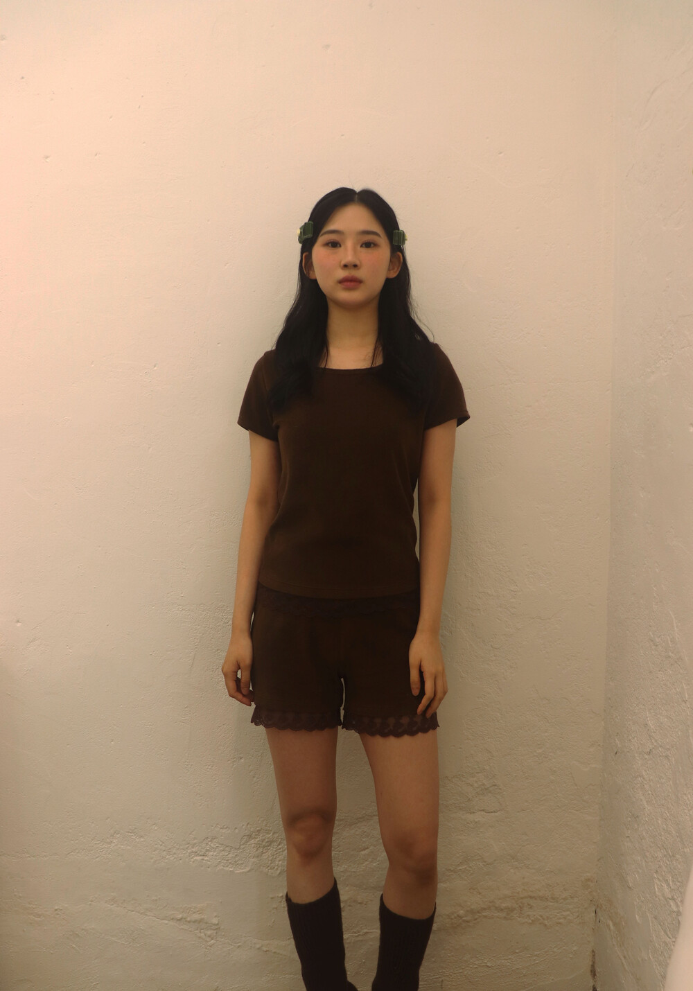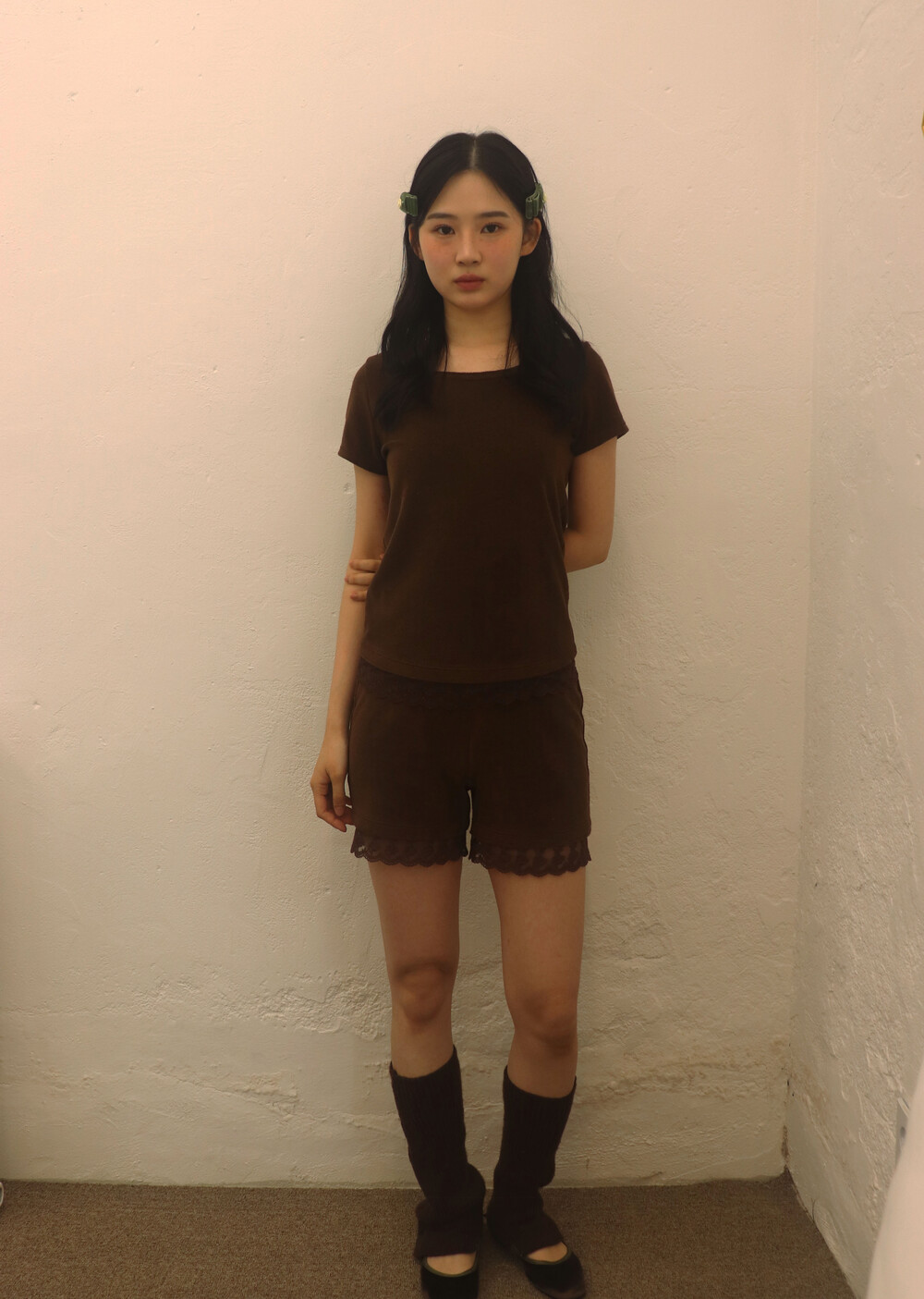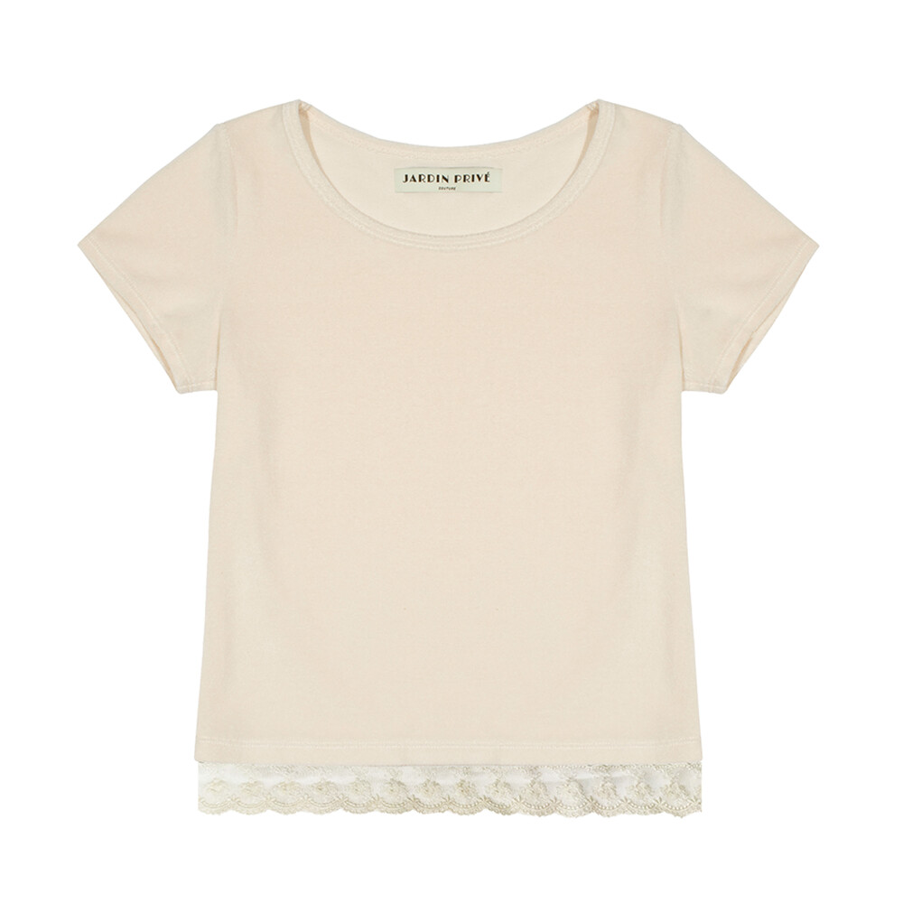 밑단 레이스 디테일이 포인트인 요 티셔츠는 기장이 조금 더 길고