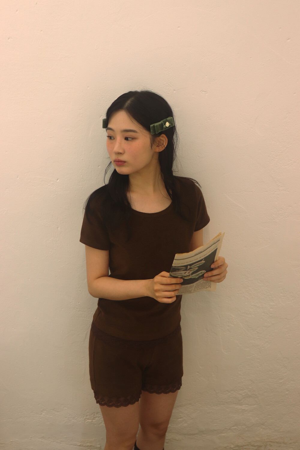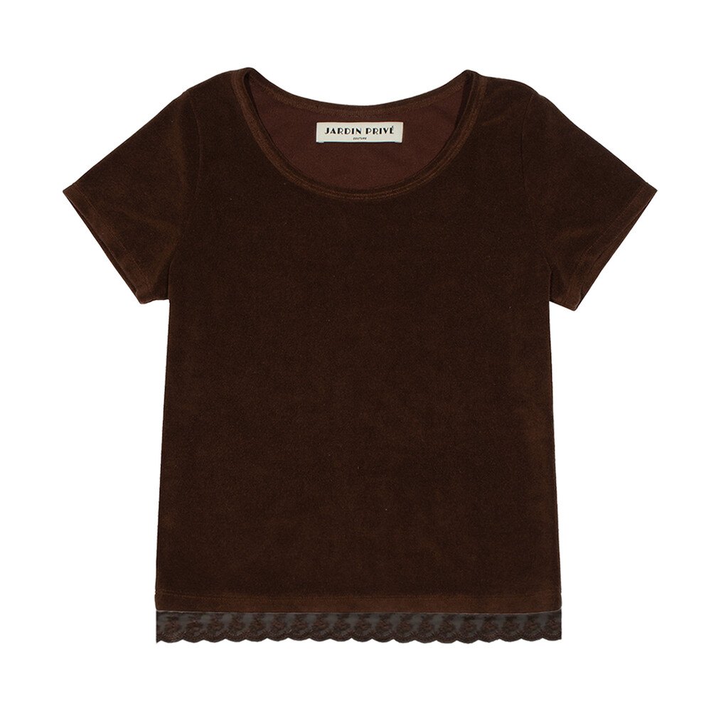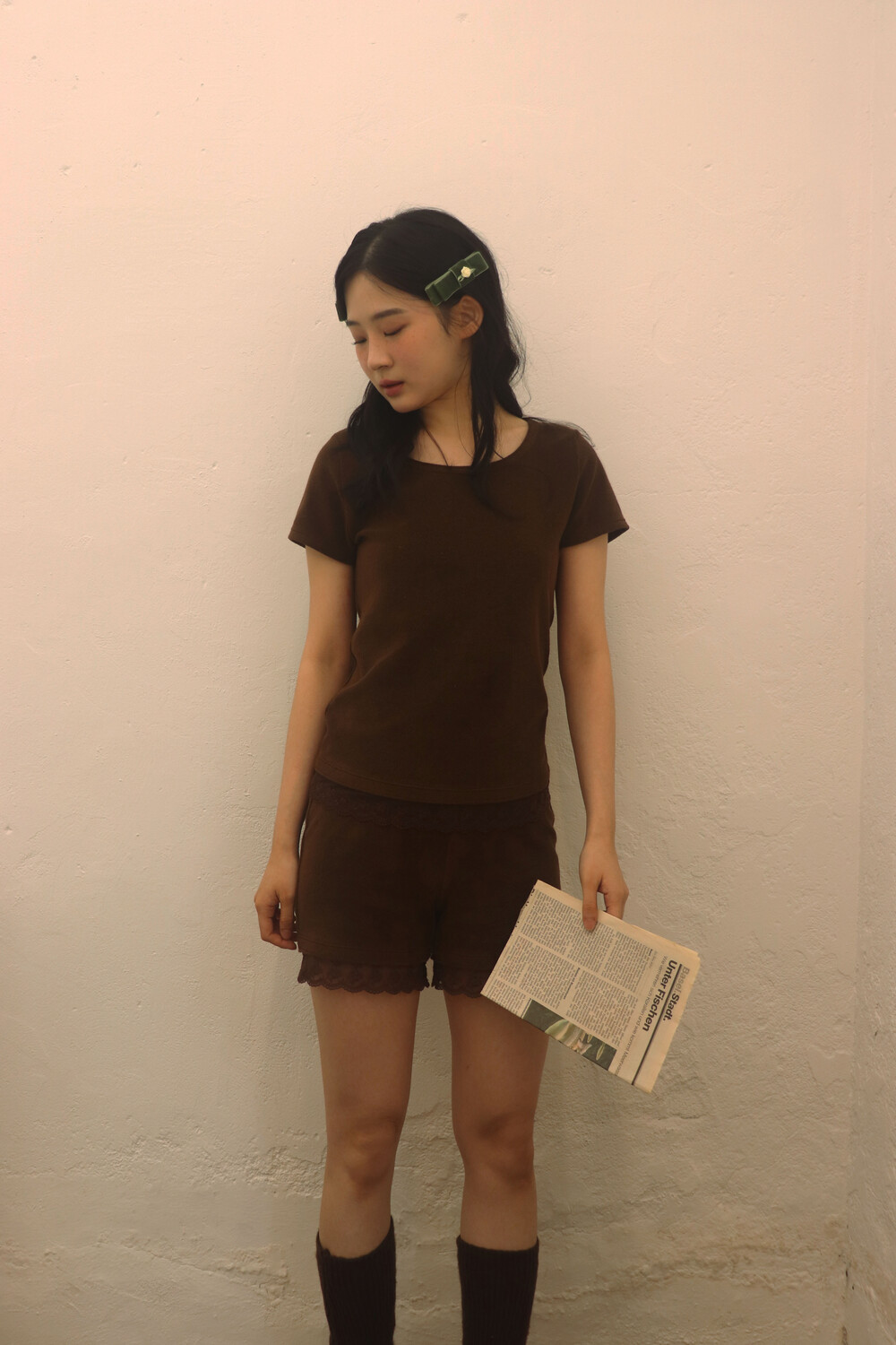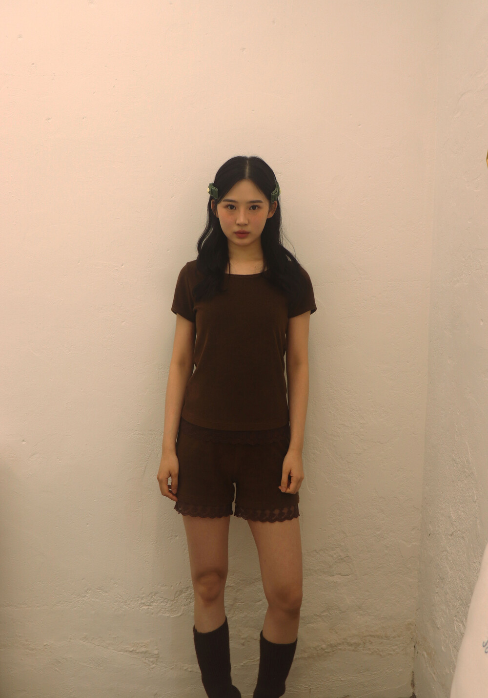 밑단 레이스 디테일이 포인트인 요 티셔츠는 기장이 조금 더 길고